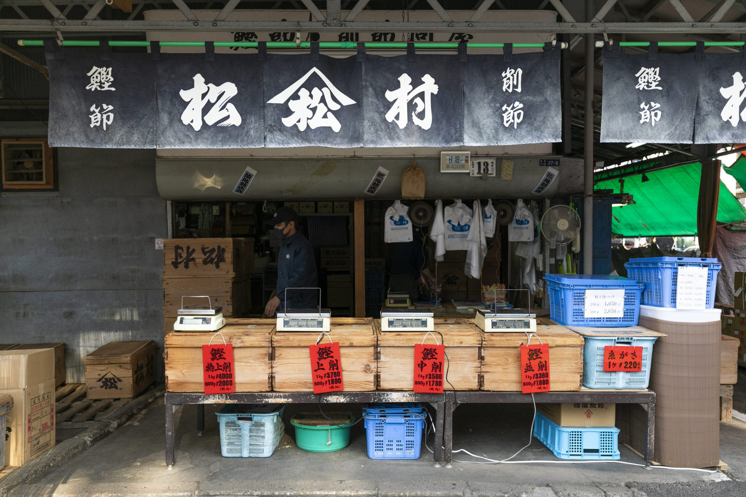 Our shop is located at the foot of Kaikōbashi Bridge in the Tsukiji Outer Market, directly in front of Namiyoke Shrine.